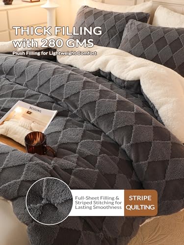 BEDELITE Fluffy Queen Comforter Set - Super Soft Sherpa Grey Comforter for Queen Size Bed, Luxury Warm Bedding Set for Winter, ...