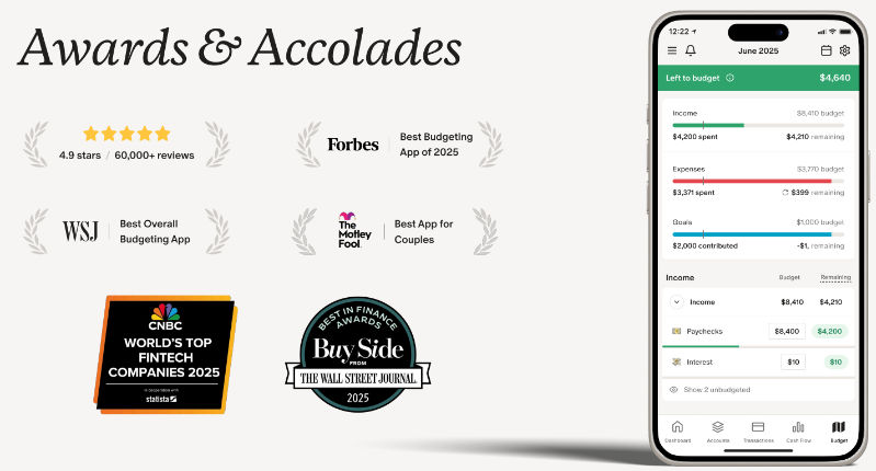 • Budgeting & Goals: Customizable zero-based budgets with flex or category based budgeting