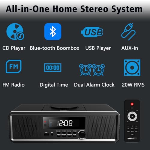 WISCENT Home Stereo System CD Player Boombox,Clear 20W RMS Sound System with FM Radio,Bluetooth,USB,MP3,AUX,Digital Dual Alarm ...