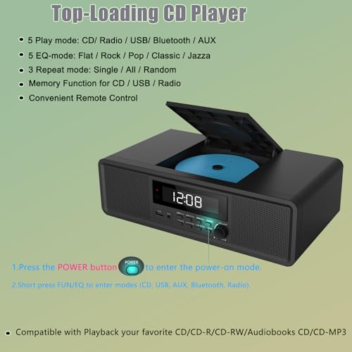 Compact Stereo System with CD Player, Bluetooth, Dual Alarms Clock, FM Radio, 20W RMS Clear Sound, USB/AUX Input, Snooze & Slee...