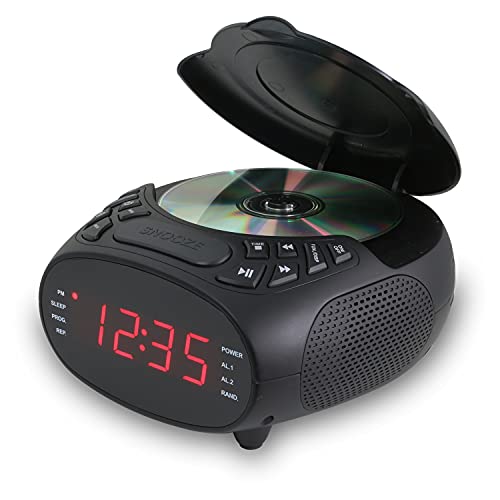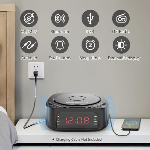 KUEPHOM CD Player Alarm Clock with Remote:CD/MP3,Bluetooth,FM Radio with Speakers,USB Charger and Dimmable Display for Bedroom-...
