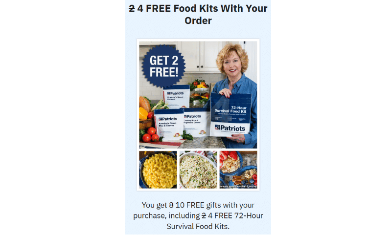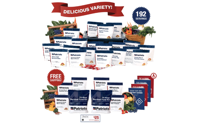 4Patriots emergency food kits include a variety of meals that cater to different tastes and dietary requirements. The 1-year survival food kit contains America’s finest mac & cheese (64 servings), Aztec chili with mango (64 servings), black bean burger mix (64 servings), buttermilk pancake mix (192 servings), cowboy rice and beans (64 servings), cozy potato soup (64 servings), creamy rice and vegetable dinner (192 servings), dinner bell broccoli bake (64 servings), fireside stew (64 servings), Frank’s favorite Alfredo (128 servings), Grammy’s sweet oatmeal (192 servings), Heartland’s finest powdered milk (192 servings), hearty stroganoff (64 servings), Ma’s hearty chili mac (128 servings), Nonna’s best lasagna-style marinara (64 servings), Nonna’s secret recipe spaghetti (64 servings), old-fashioned chocolate and vanilla pudding (96 servings each), potatoes O’Brien (64 servings), Spanish rice (128 servings), white rice (256 servings), star-spangled tropical energy drink (160 servings), strawberry cream wheat (160 servings), and sweetly coated banana chips (128 servings).