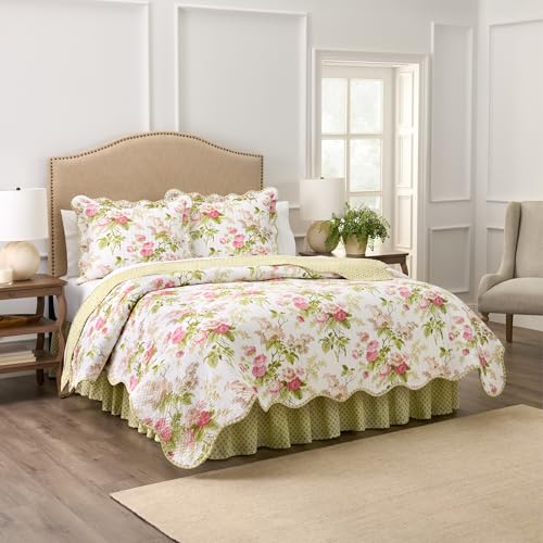 Waverly Emma’s Garden 4-Piece Quilt Set – Full/Queen - Blossom Floral Print - 100% Cotton with Scalloped Edge & Striped Bed Ski...