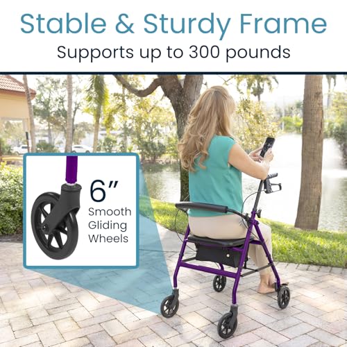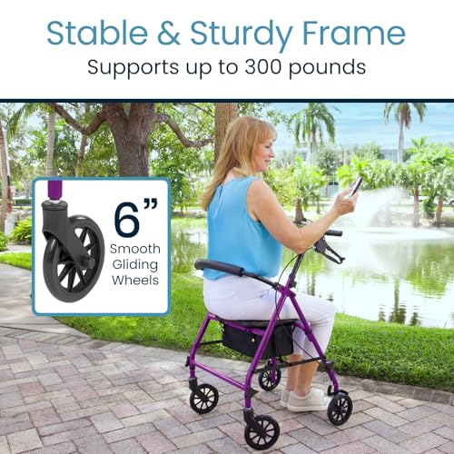 Vive Mobility Steel Rollator Walker with Seat - Foldable, Narrow, Rolling Senior Walker for Small Spaces - 4 Wheel Lightweight ...